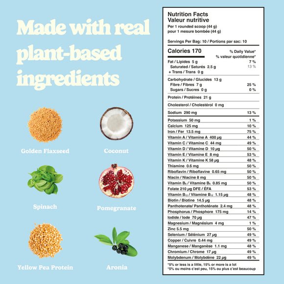 Protein blend (pea protein, milled golden flaxseed), natural flavours, soluble tapioca fibers, coconut milk powder* (coconut milk powder*, tapioca maltodextrin*, acacia gum*), acacia gum, guar gum, xanthan gum, medium chain triglycerides (medium chain triglycerides from coconut oil, acacia gum), fruits, vegetables, and mushrooms blend (broccoli, spinach, kale, pumpkin, sweet potato, sunflower seed, cranberry, chlorella, maitake mushroom, shiitake mushroom, pomegranate juice powder*, acai juice powder*, goji juice powder*, grape juice powder*, amla fruit powder*, aronia powder*, sea buckthorn juice powder*, camu camu powder*, acerola juice powder*), rebaudioside M, salt, and bacterial culture and enzymes blend (rice maltodextrin, Bacillus subtilis, amylase, protease). *Organic ingredients..